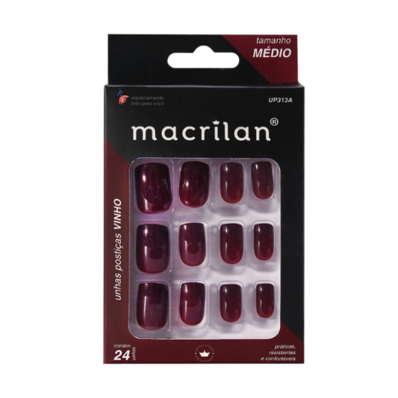 Unhas postiças UP313A tamanho médio Macrilan cor Vinho, especialmente desenvolvidas em uma versão colorida para uma aplicação rápida e segura. Indicadas para uso pessoal e profissional.