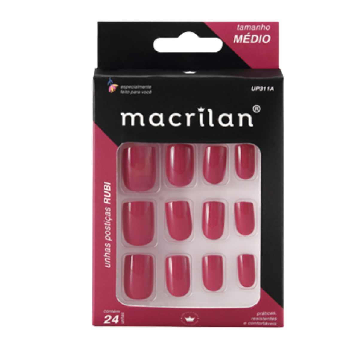 Unhas postiças UP311A tamanho médio Macrilan cor Rubi, especialmente desenvolvidas em uma versão colorida para uma aplicação rápida e segura. Indicadas para uso pessoal e profissional.