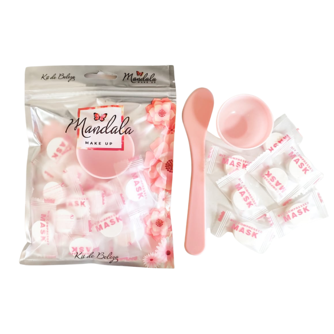 Esse kit é incrível para quem busca produtos de skincare. Contém 20 unidades de máscara desidratada, ela abre por inteiro quando entra em contato com a água! Parece mágica! Com pote para você estar realizando suas misturinhas mais a espatula que não pode faltar.