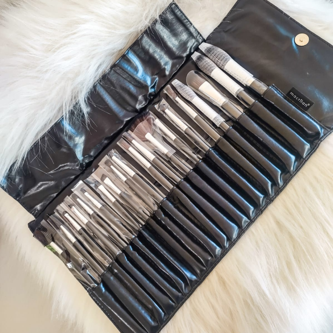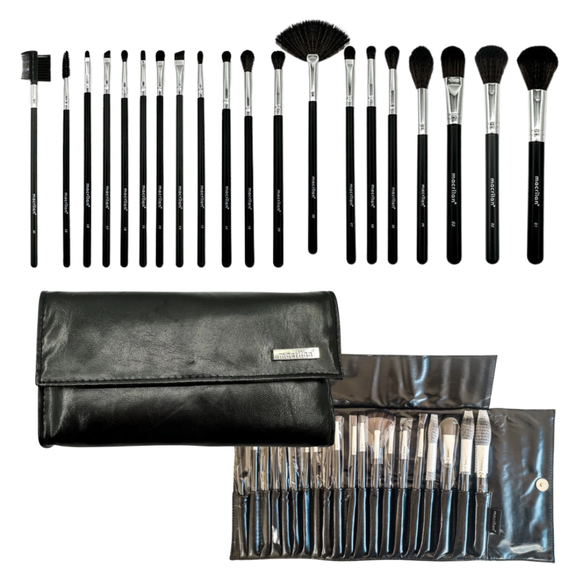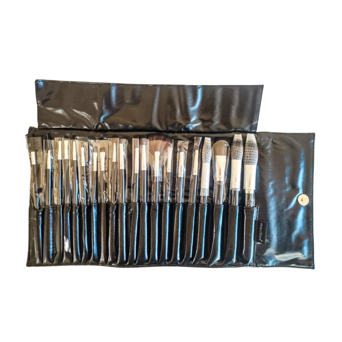 Kit KP20 com 20 pincéis para maquiagem da Macrilan, especialmente desenvolvido com cerdas sintéticas macias e arredondadas para maquiagem leve e uniforme. Acompanha bolsa para transporte e conservação dos pincéis.