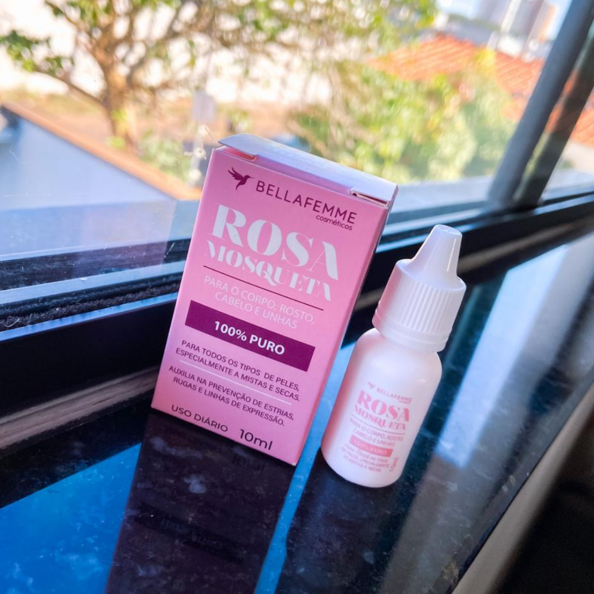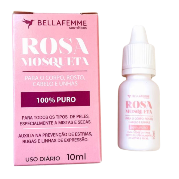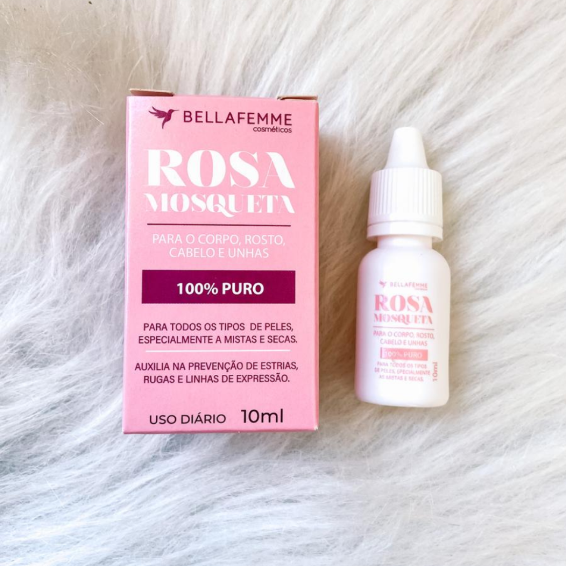 Oleo de rosa mosqueta da Bella Femme 100% puro. Para todos os tipos de pele, especialmente as mistas e secas. Auxilia na prevenção de estrias, rugas e linhas de expressão.