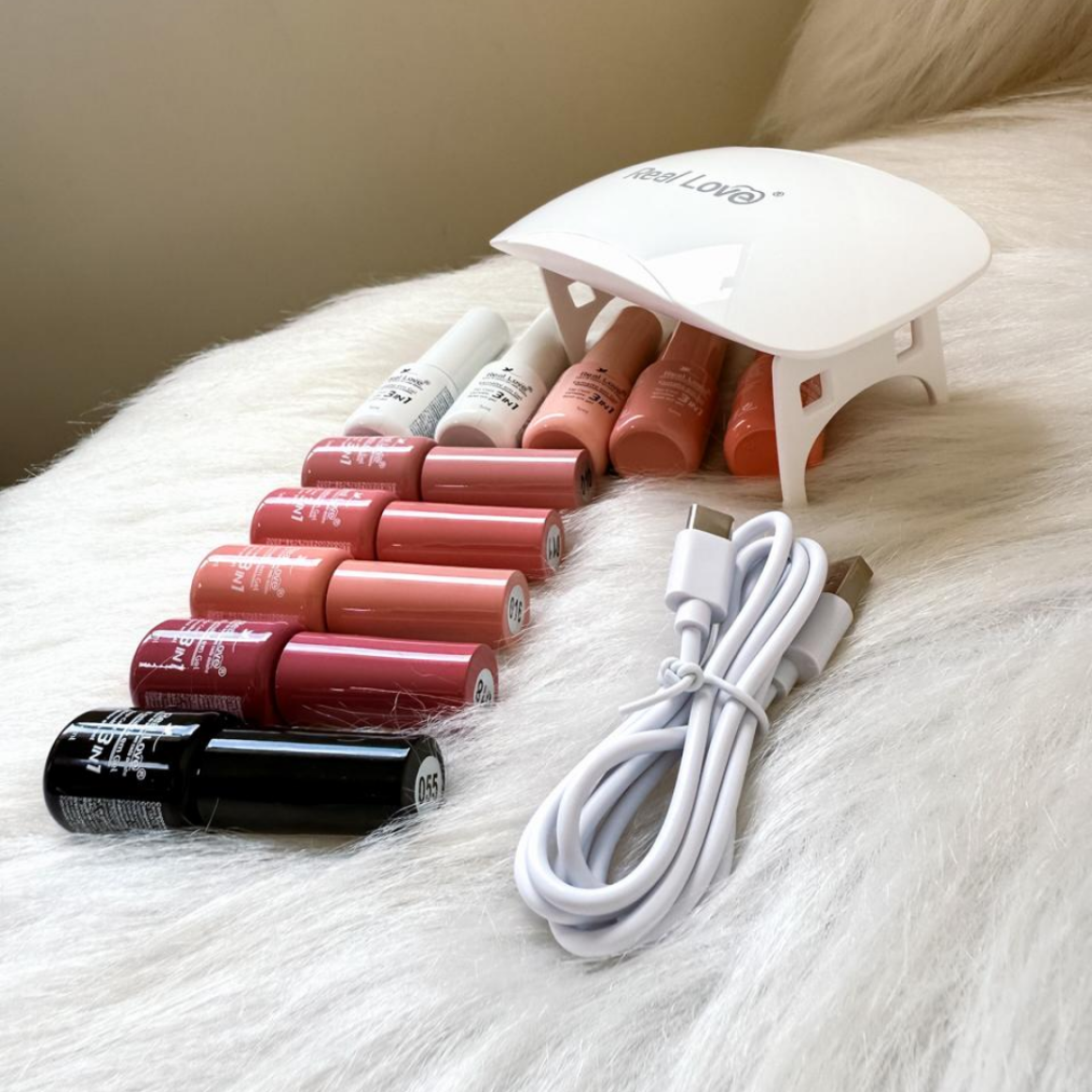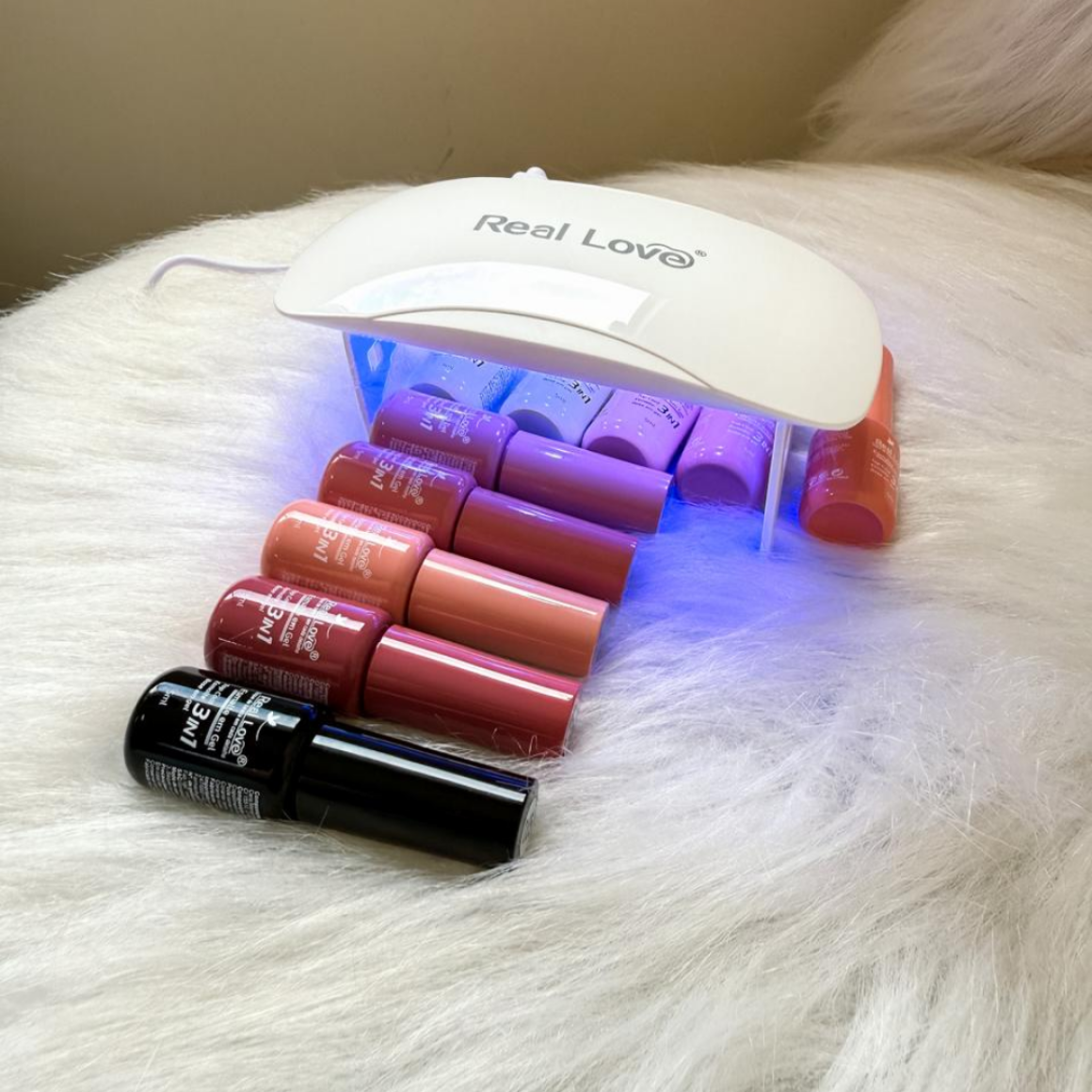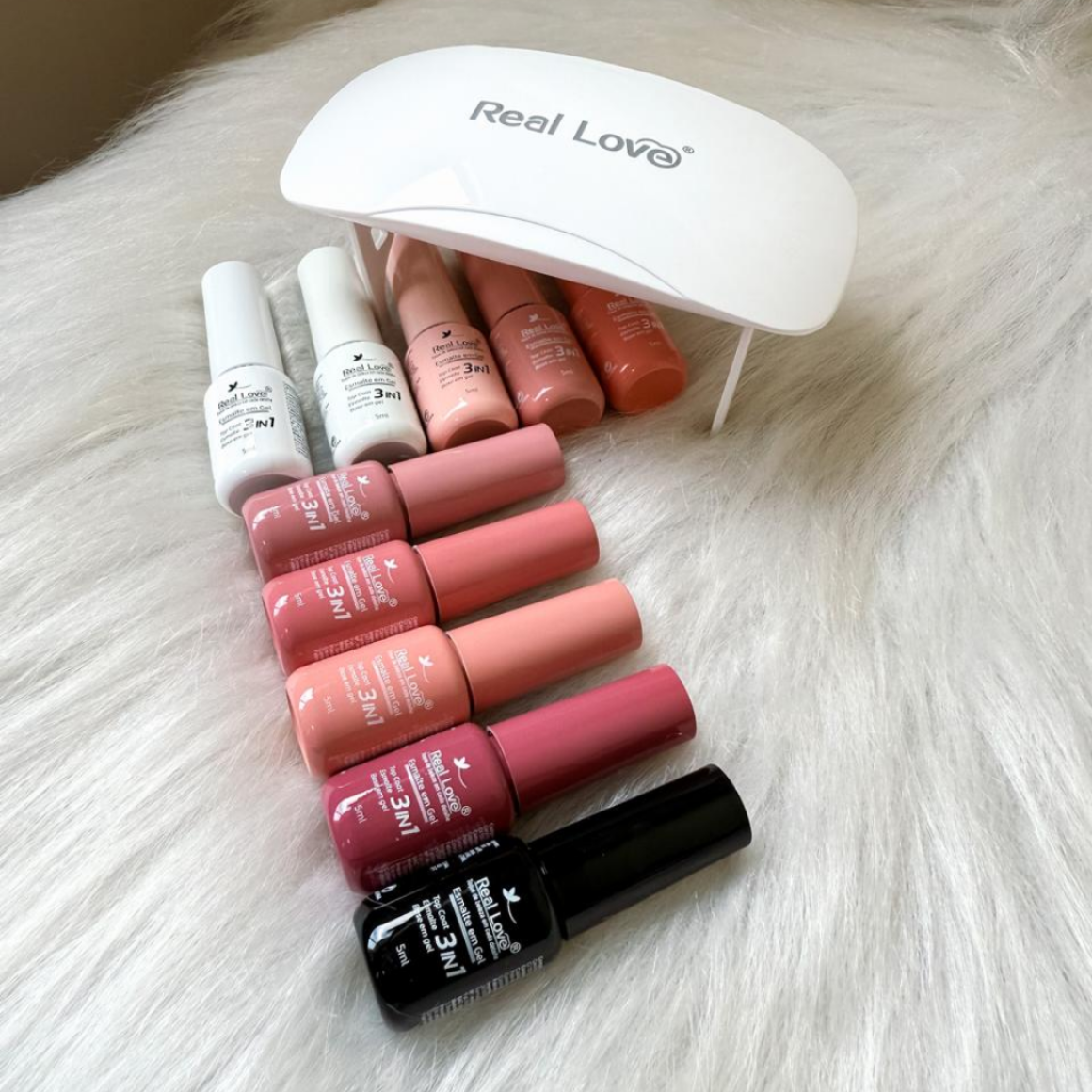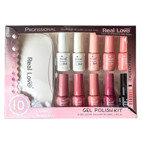 Este kit inclui 10 núcleos de esmalte 3 em 1 e vem com um Mini Cabine - Real Love. Consiga unhas de gel com qualidade profissional no conforto da sua casa.